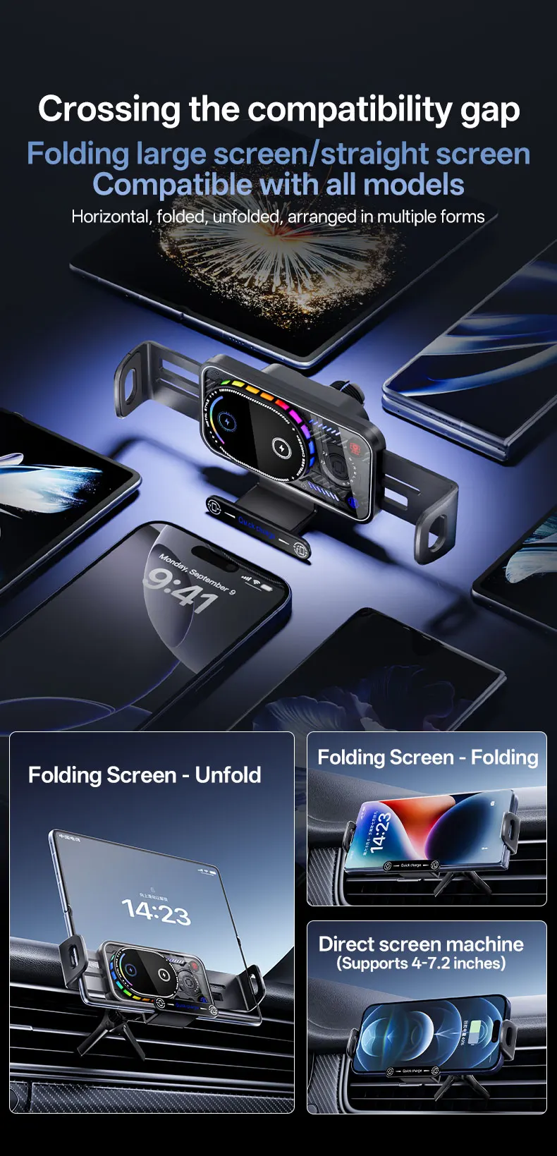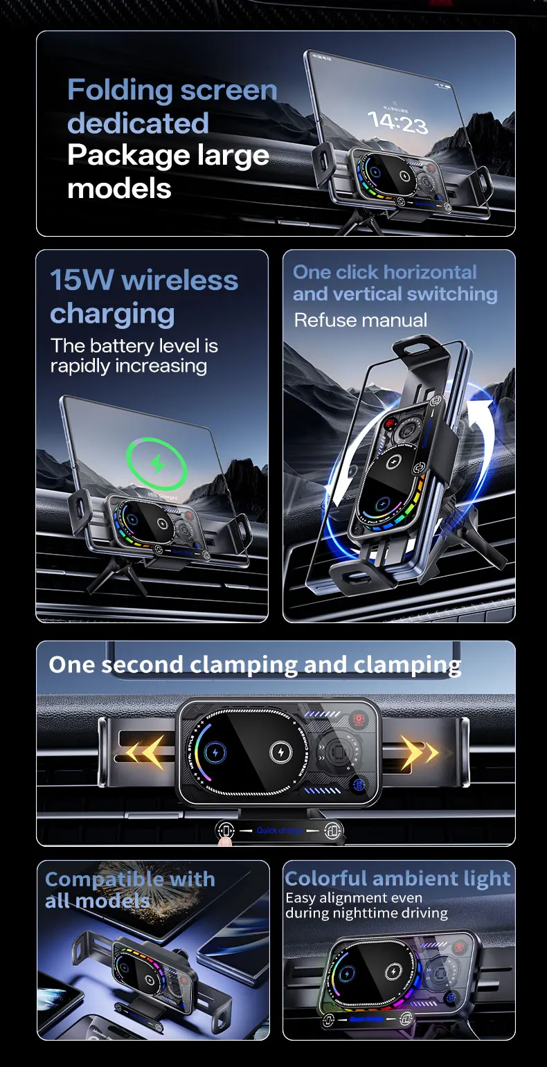 Universal Foldable Car Mount Wireless Charger 15W Dual-Coil Fast Charging Air Vent Phone Holder for iPhone Samsung Fold Series