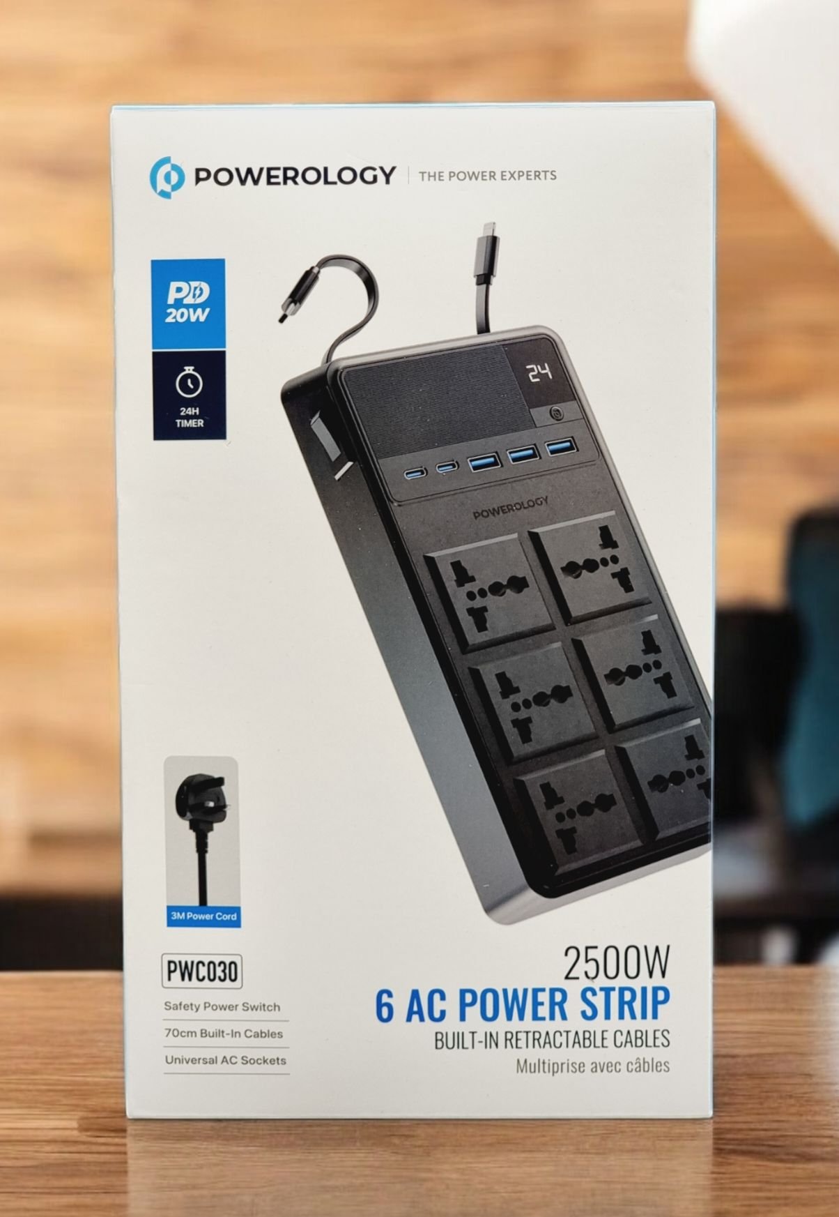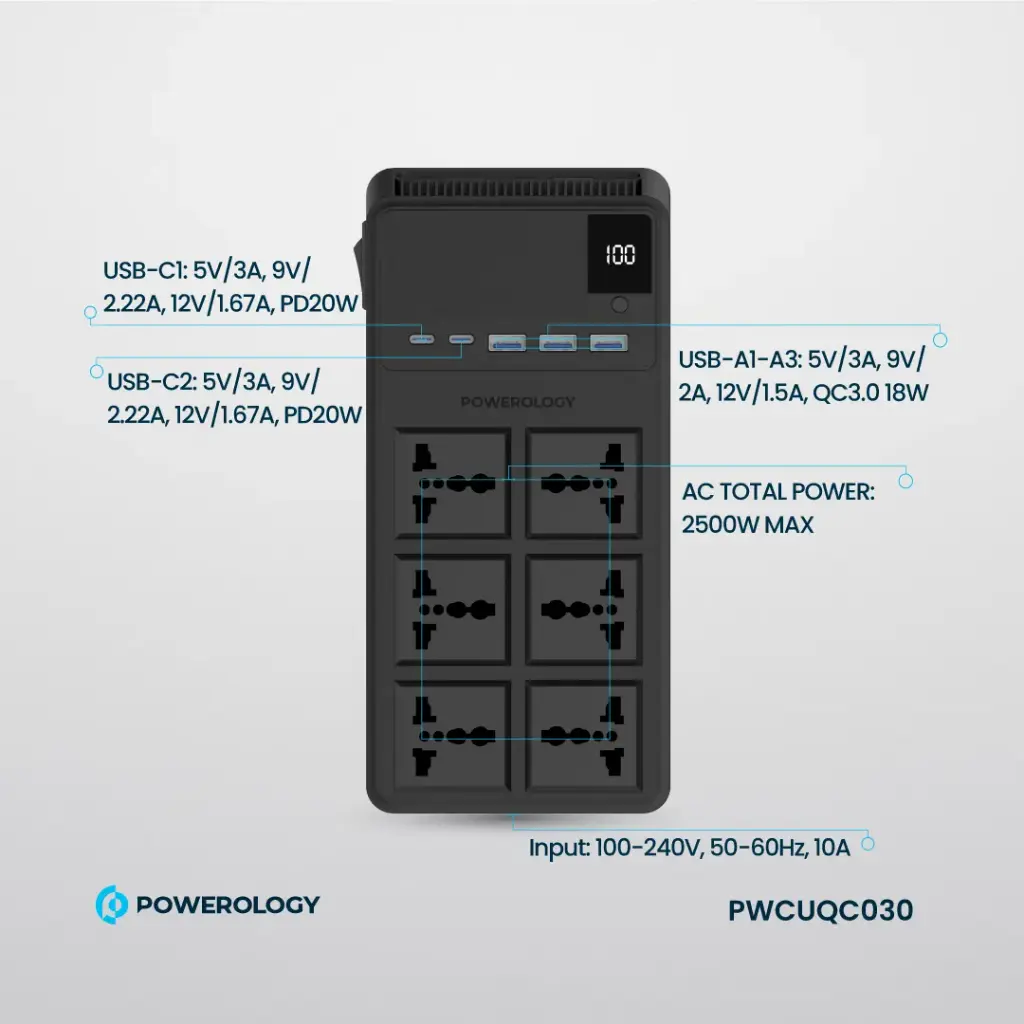 The Powerology 2500W 6AC Power Strip with Built-In Retractable Cables – Black is the most versatile tool for charging and powering devices in a home or an office. Compatible with a voltage between 100-240V and a maximum of 10A, this power strip disperses an impressive 2500W of AC power within the device, making it easy to run multiple devices. It has six universal AC outlets, 2 PD20W USB-C ports, 3 QC3.0 USB-A ports, and USB-C and Lightning cables, which would work for many devices. The built-in cable retractor, 70 cm cables, and 3M UK power cord extend accessibility and usability, while the built-in features and thermal insulation safeguard the user while using the device. With a total DC output of 58W, it is suitable for fast-charging devices. Overload safety switch control is provided for additional functionality, while the robust case design is meant to last. The device is effective and practical for charging phones, tablets, computers, and almost any kind of electronics while ensuring safety within the feature-rich design of the power strip.